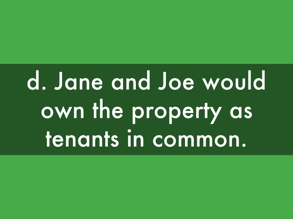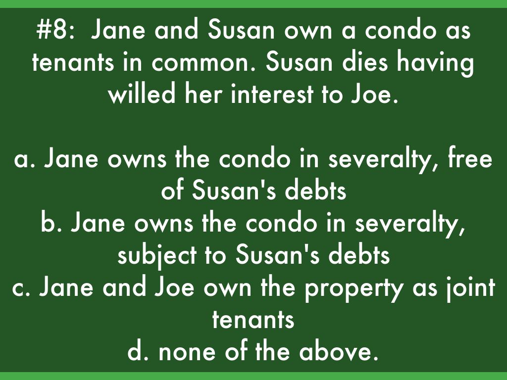 #8: Jane and Susan own a condo as tenants in common. Susan dies having willed her interest to Joe.