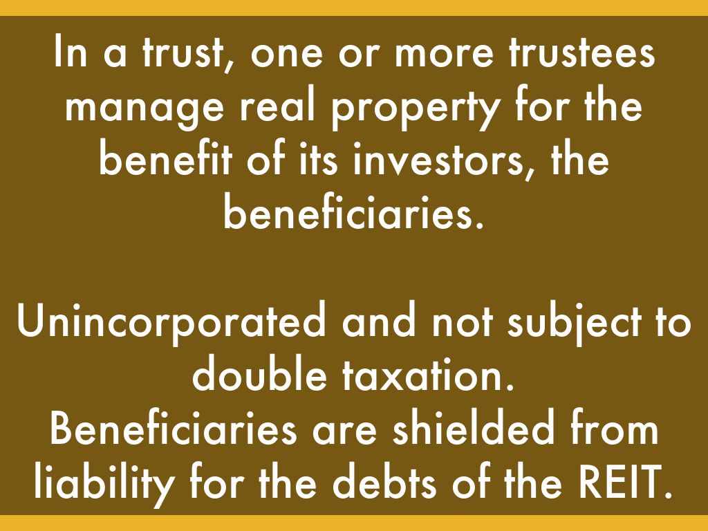 In a trust, one or more trustees manage real property for the benefit of its investors, the beneficiaries.