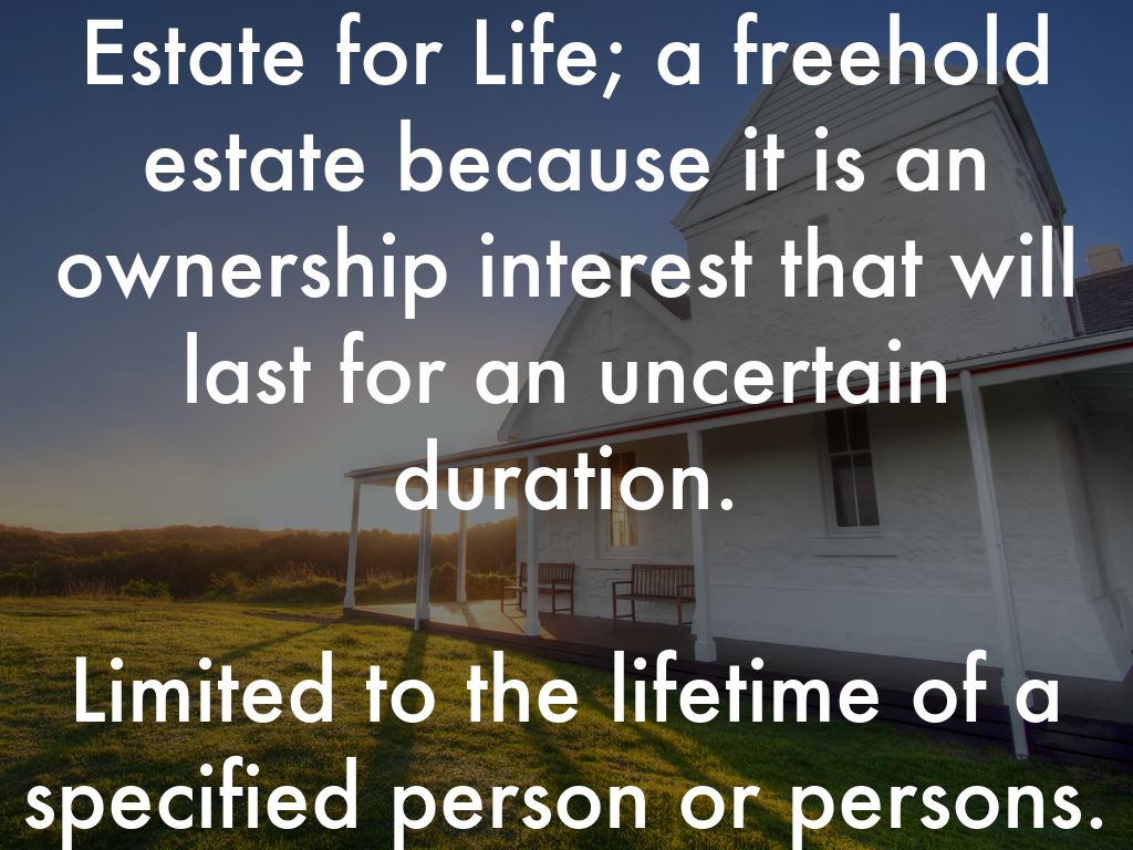 Estate for Life; a freehold estate because it is an ownership interest that will last for an uncertain duration.