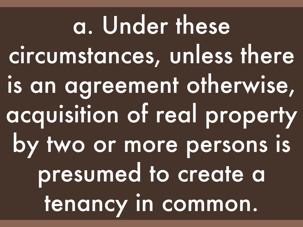 a. Under these circumstances, unless there is an agreement otherwise, acquisition of real property by two or more persons is presumed to create a tenancy in common.