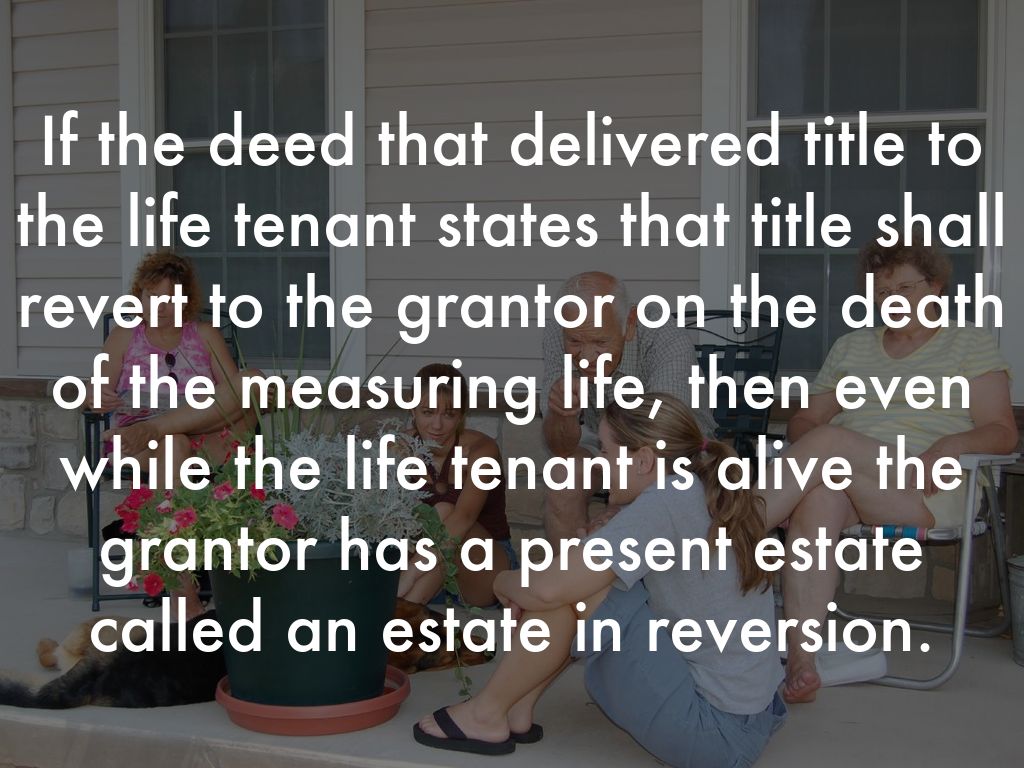 If the deed that delivered title to the life tenant states that title shall revert to the grantor on the death of the measuring life, then even while the life tenant is alive the grantor has a present estate called an estate in reversion.