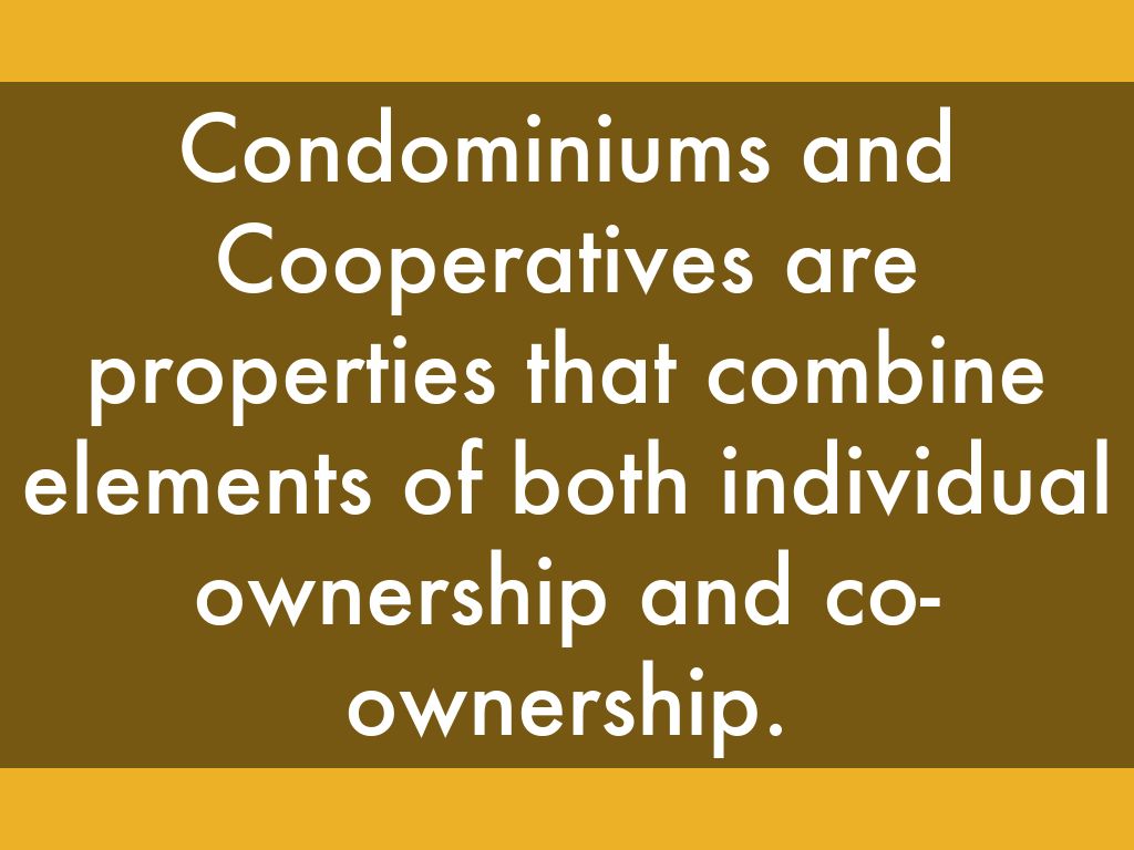 Condominiums and Cooperatives are properties that combine elements of both individual ownership and co-ownership.