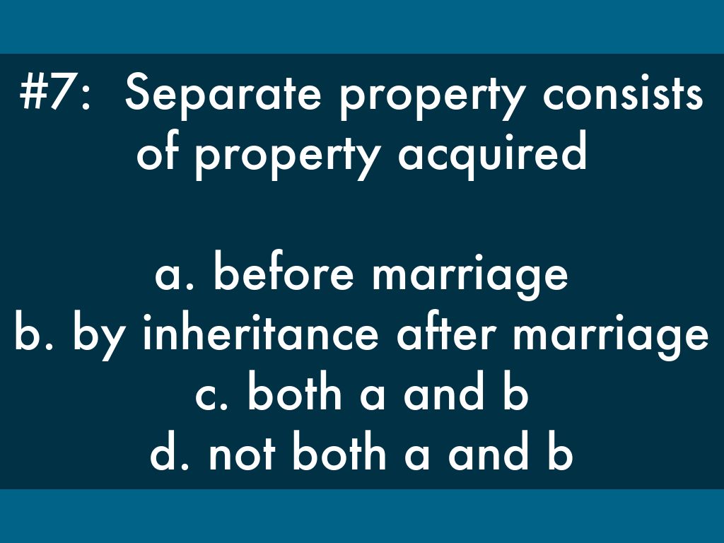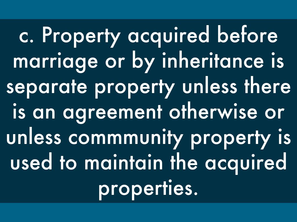 c. Property acquired before marriage or by inheritance is separate property unless there is an agreement otherwise or unless commmunity property is used to maintain the acquired properties.