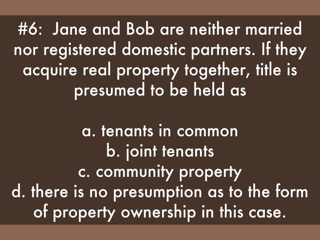 #6: Jane and Bob are neither married nor registered domestic partners. If they acquire real property together, title is presumed to be held as