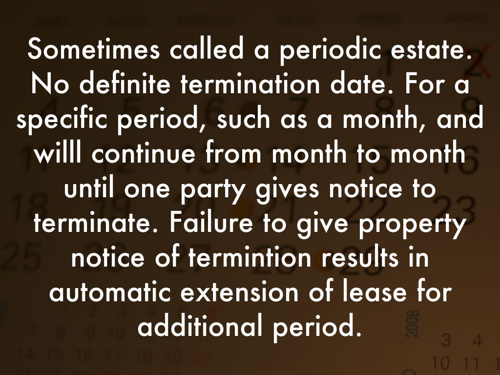 No definite termination date. For a specific period, such as a month, and willl continue from month to month until one party gives notice to terminate. Failure to give property notice of termintion results in automatic extension of lease for additional period.