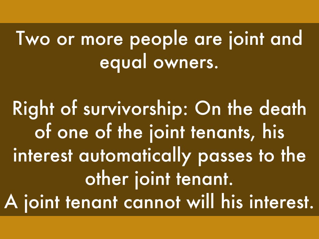 Right of survivorship: On the death of one of the joint tenants, his interest automatically passes to the other joint tenant.