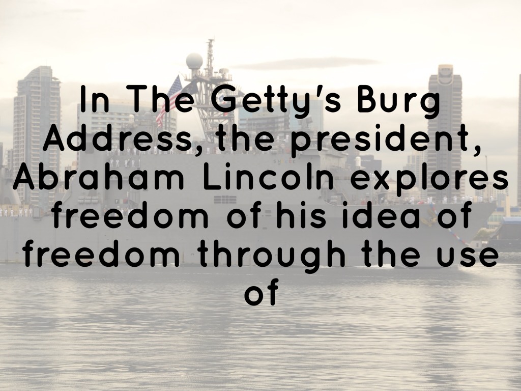 In The Getty's Burg Address, the president, Abraham Lincoln explores freedom of his idea of freedom through the use of