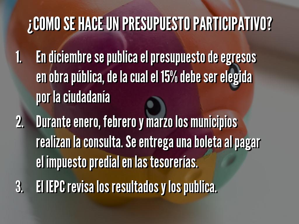 PRESUPUESTO PARTICIPATIVO: Con esta herramienta los ciudadanos podemos elegir de una lista de propuestas, las obras públicas que realizará el municipio en un año fiscal. Así, nosotros podemos dar prioridad a aquellas que más nos beneficien para que se utilicen los recursos públicos en su realización.