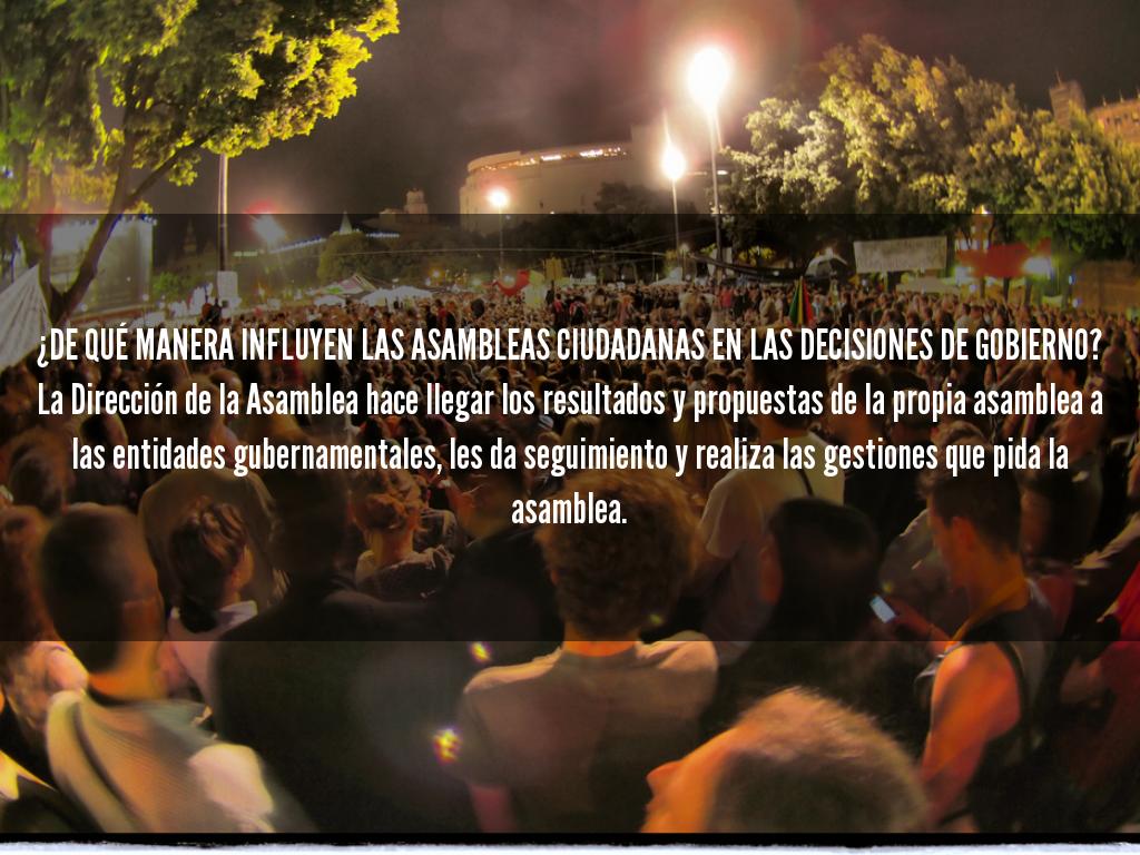 ¿DE QUÉ MANERA INFLUYEN LAS ASAMBLEAS CIUDADANAS EN LAS DECISIONES DE GOBIERNO? La Dirección de la Asamblea hace llegar los resultados y propuestas de la propia asamblea a las entidades gubernamentales, les da seguimiento y realiza las gestiones que pida la asamblea.