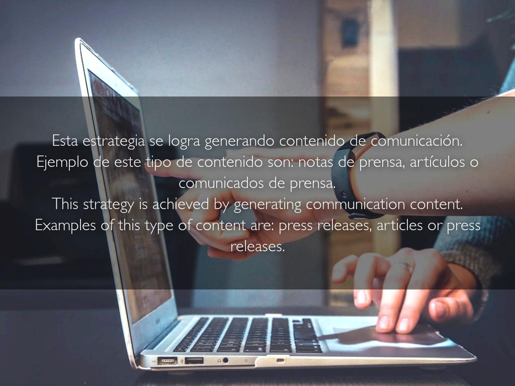 Esta estrategia se logra generando contenido de comunicación. Ejemplo de este tipo de contenido son: notas de prensa, artículos o comunicados de prensa. This strategy is achieved by generating communication content. Examples of this type of content are: press releases, articles or press releases.