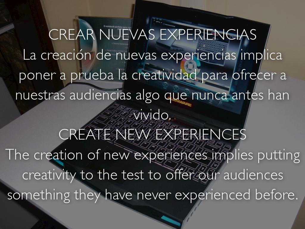 CREAR NUEVAS EXPERIENCIAS La creación de nuevas experiencias implica poner a prueba la creatividad para ofrecer a nuestras audiencias algo que nunca antes han vivido. CREATE NEW EXPERIENCES The creation of new experiences implies putting creativity to the test to offer our audiences something they have never experienced before.