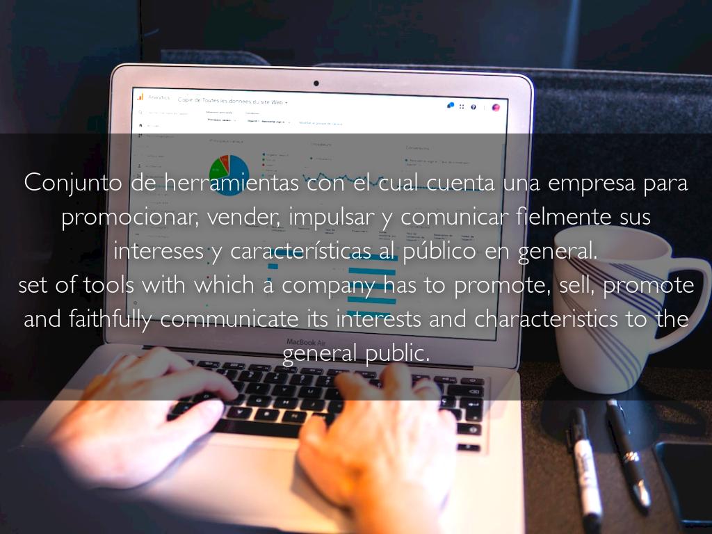 Conjunto de herramientas con el cual cuenta una empresa para promocionar, vender, impulsar y comunicar fielmente sus intereses y características al público en general. set of tools with which a company has to promote, sell, promote and faithfully communicate its interests and characteristics to the general public.