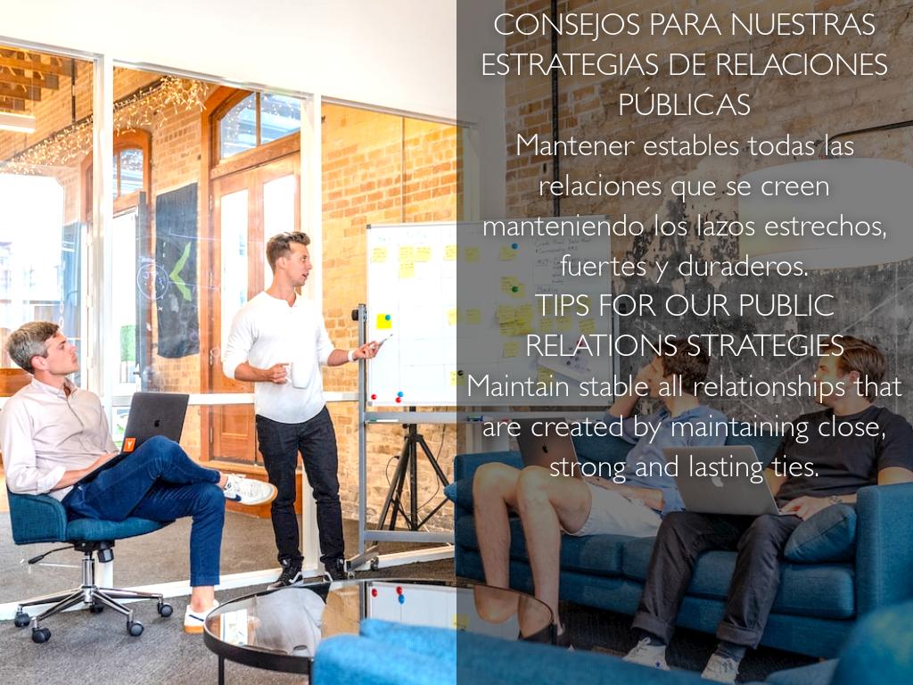 CONSEJOS PARA NUESTRAS ESTRATEGIAS DE RELACIONES PÚBLICAS Mantener estables todas las relaciones que se creen manteniendo los lazos estrechos, fuertes y duraderos. TIPS FOR OUR PUBLIC RELATIONS STRATEGIES Maintain stable all relationships that are created by maintaining close, strong and lasting ties.