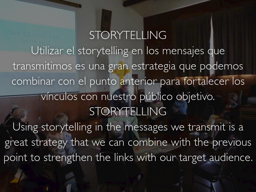 STORYTELLING Utilizar el storytelling en los mensajes que transmitimos es una gran estrategia que podemos combinar con el punto anterior para fortalecer los vínculos con nuestro público objetivo. STORYTELLING Using storytelling in the messages we transmit is a great strategy that we can combine with the previous point to strengthen the links with our target audience.