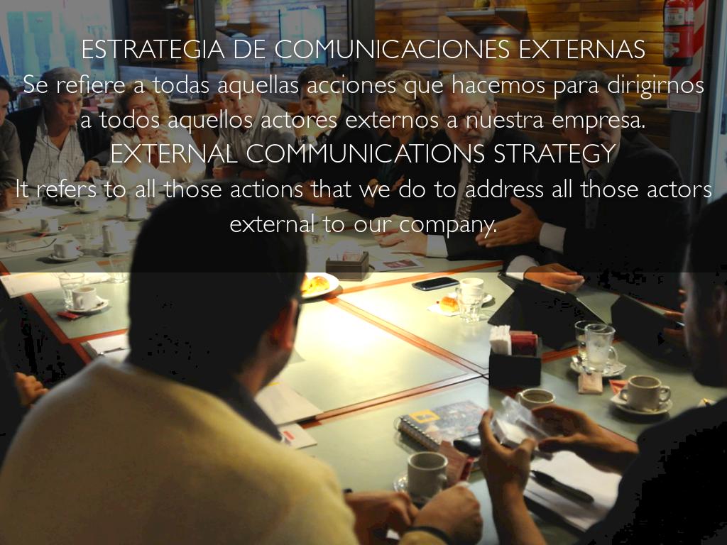 ESTRATEGIA DE COMUNICACIONES EXTERNAS Se refiere a todas aquellas acciones que hacemos para dirigirnos a todos aquellos actores externos a nuestra empresa. EXTERNAL COMMUNICATIONS STRATEGY It refers to all those actions that we do to address all those actors external to our company.