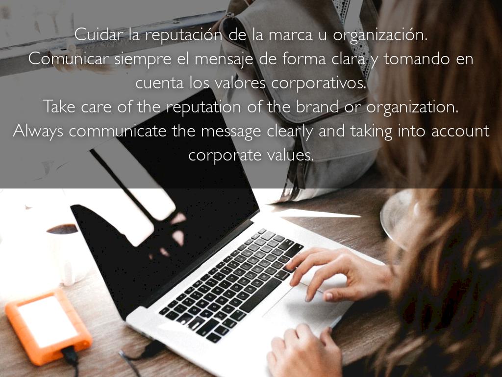 Cuidar la reputación de la marca u organización. Comunicar siempre el mensaje de forma clara y tomando en cuenta los valores corporativos. Take care of the reputation of the brand or organization. Always communicate the message clearly and taking into account corporate values.