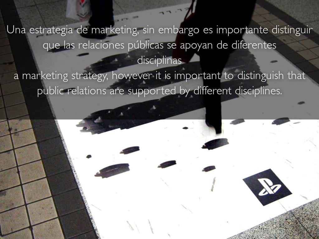 Una estrategia de marketing, sin embargo es importante distinguir que las relaciones públicas se apoyan de diferentes disciplinas a marketing strategy, however it is important to distinguish that public relations are supported by different disciplines.