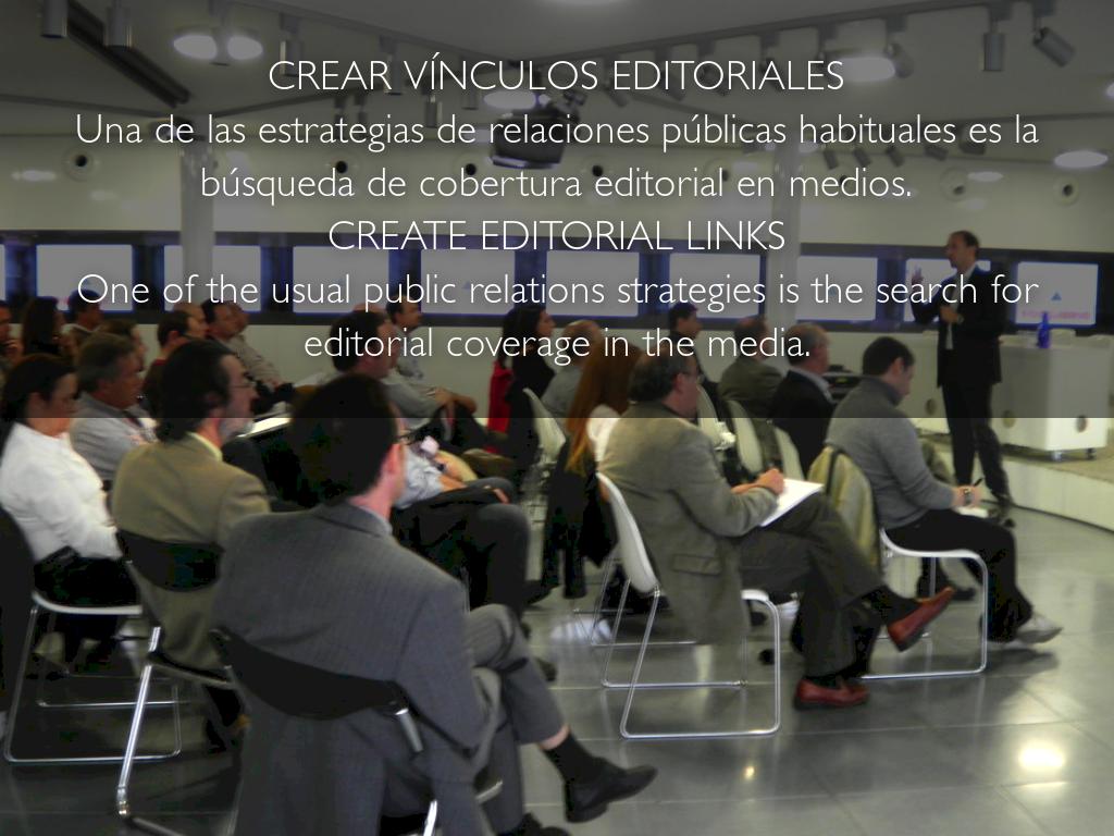 CREAR VÍNCULOS EDITORIALES Una de las estrategias de relaciones públicas habituales es la búsqueda de cobertura editorial en medios. CREATE EDITORIAL LINKS One of the usual public relations strategies is the search for editorial coverage in the media.