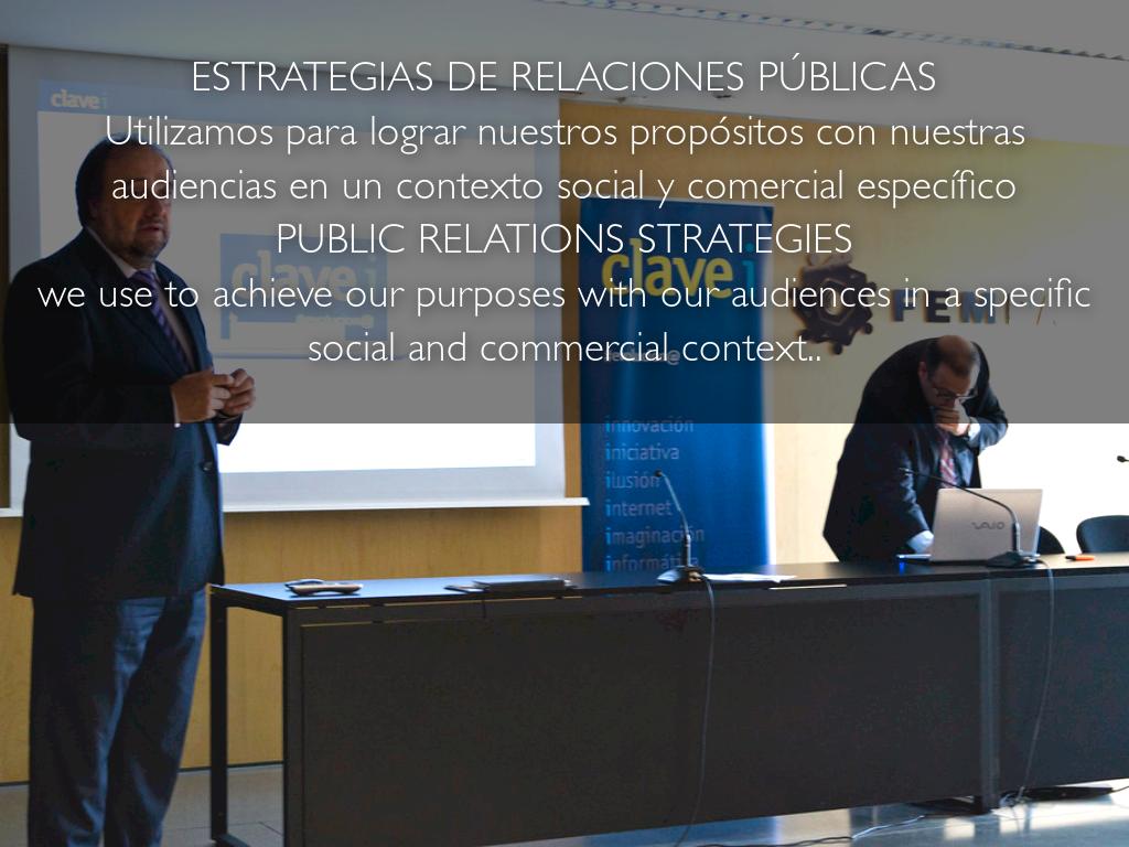 ESTRATEGIAS DE RELACIONES PÚBLICAS Utilizamos para lograr nuestros propósitos con nuestras audiencias en un contexto social y comercial específico PUBLIC RELATIONS STRATEGIES we use to achieve our purposes with our audiences in a specific social and commercial context..