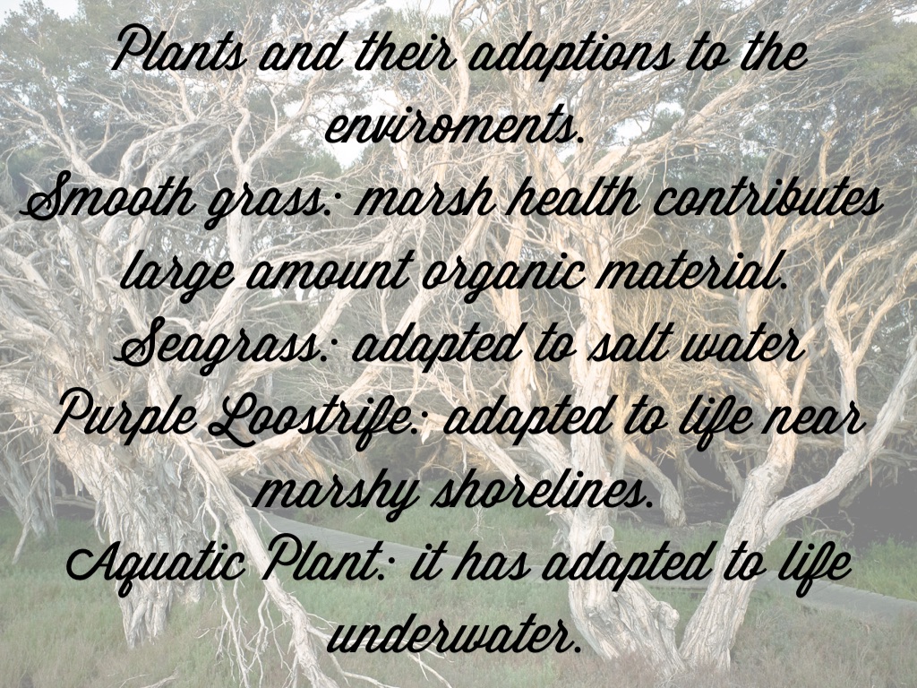 Plants and their adaptions to the enviroments. Smooth grass: marsh health contributes large amount organic material. Seagrass: adapted to salt water Purple Loostrife: adapted to life near marshy shorelines. Aquatic Plant: it has adapted to life underwater.