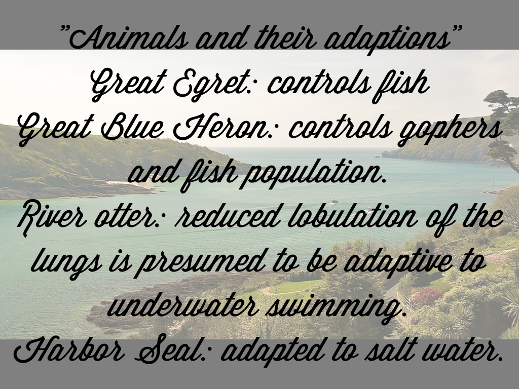 "Animals and their adaptions" Great Egret: controls fish Great Blue Heron: controls gophers and fish population. River otter: reduced lobulation of the lungs is presumed to be adaptive to underwater swimming. Harbor Seal: adapted to salt water.