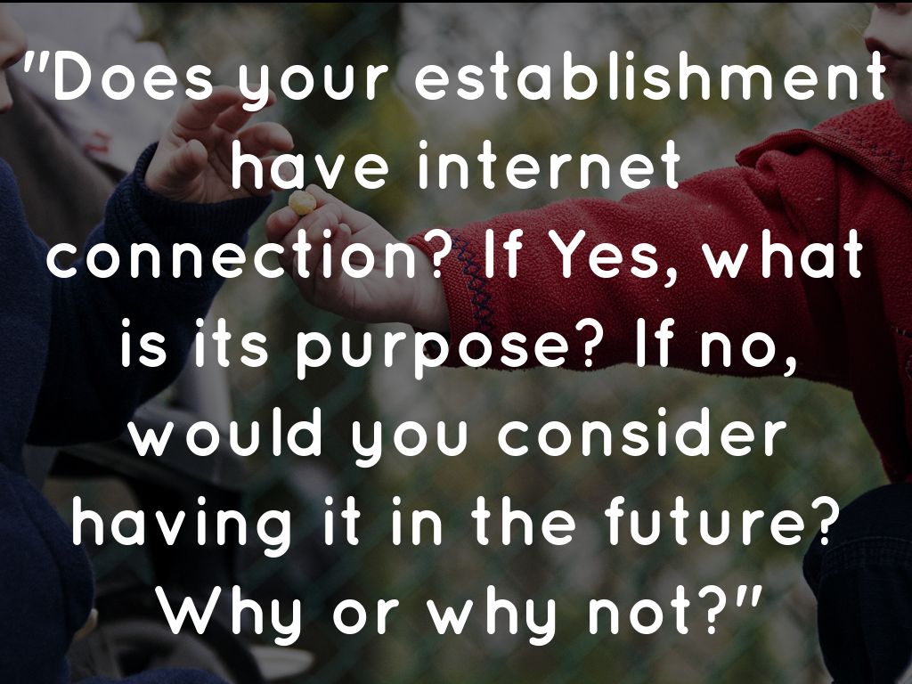 "Does your establishment have internet connection? If Yes, what is its purpose? If no, would you consider having it in the future? Why or why not?"