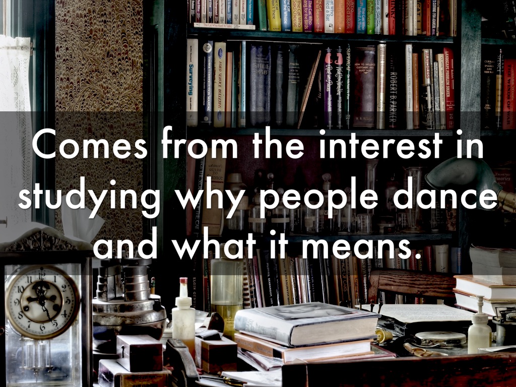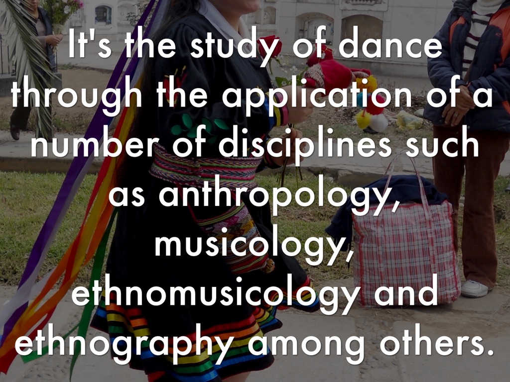 It's the study of dance through the application of a number of disciplines such as anthropology, musicology, ethnomusicology and ethnography among others.