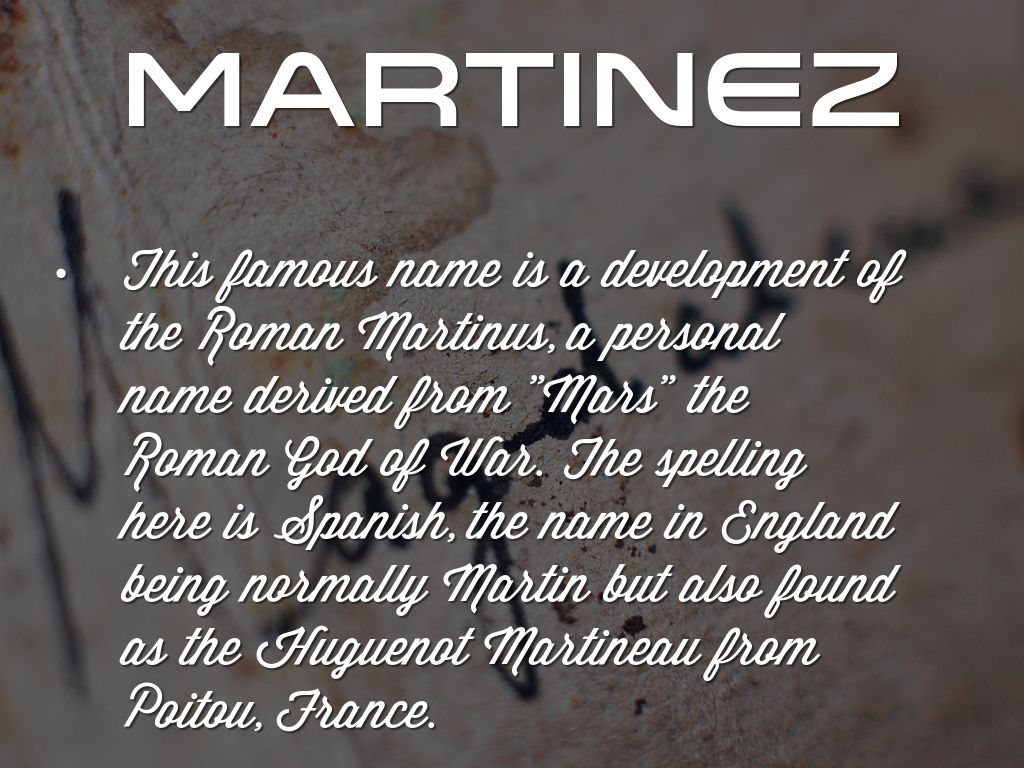 This famous name is a development of the Roman Martinus, a personal name derived from "Mars" the Roman God of War. The spelling here is Spanish, the name in England being normally Martin but also found as the Huguenot Martineau from Poitou, France.