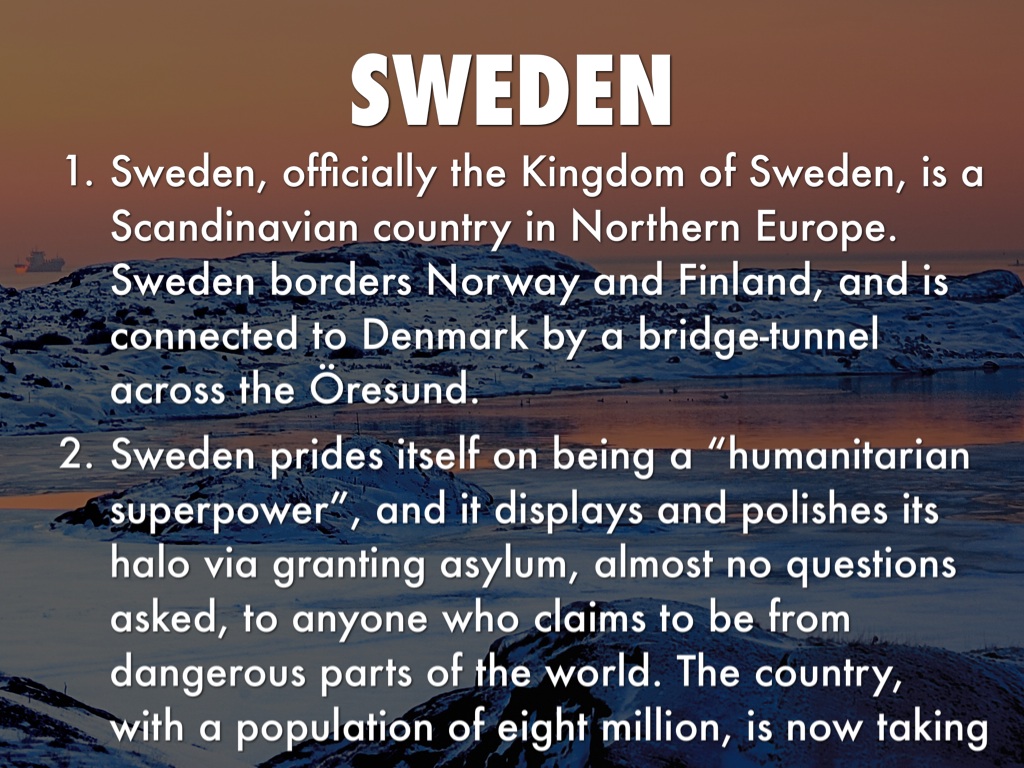 Sweden prides itself on being a “humanitarian superpower”, and it displays and polishes its halo via granting asylum, almost no questions asked, to anyone who claims to be from dangerous parts of the world. The country, with a population of eight million, is now taking more than 100,000 refugees per annum and it’s rising 20% year on year.