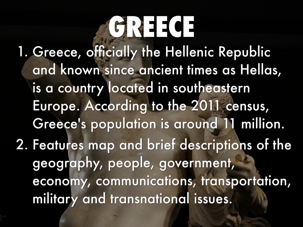 Greece, officially the Hellenic Republic and known since ancient times as Hellas, is a country located in southeastern Europe. According to the 2011 census, Greece's population is around 11 million.