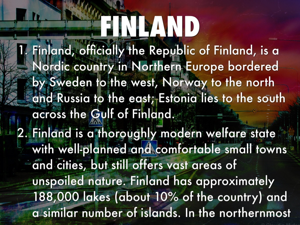 Finland, officially the Republic of Finland, is a Nordic country in Northern Europe bordered by Sweden to the west, Norway to the north and Russia to the east; Estonia lies to the south across the Gulf of Finland.