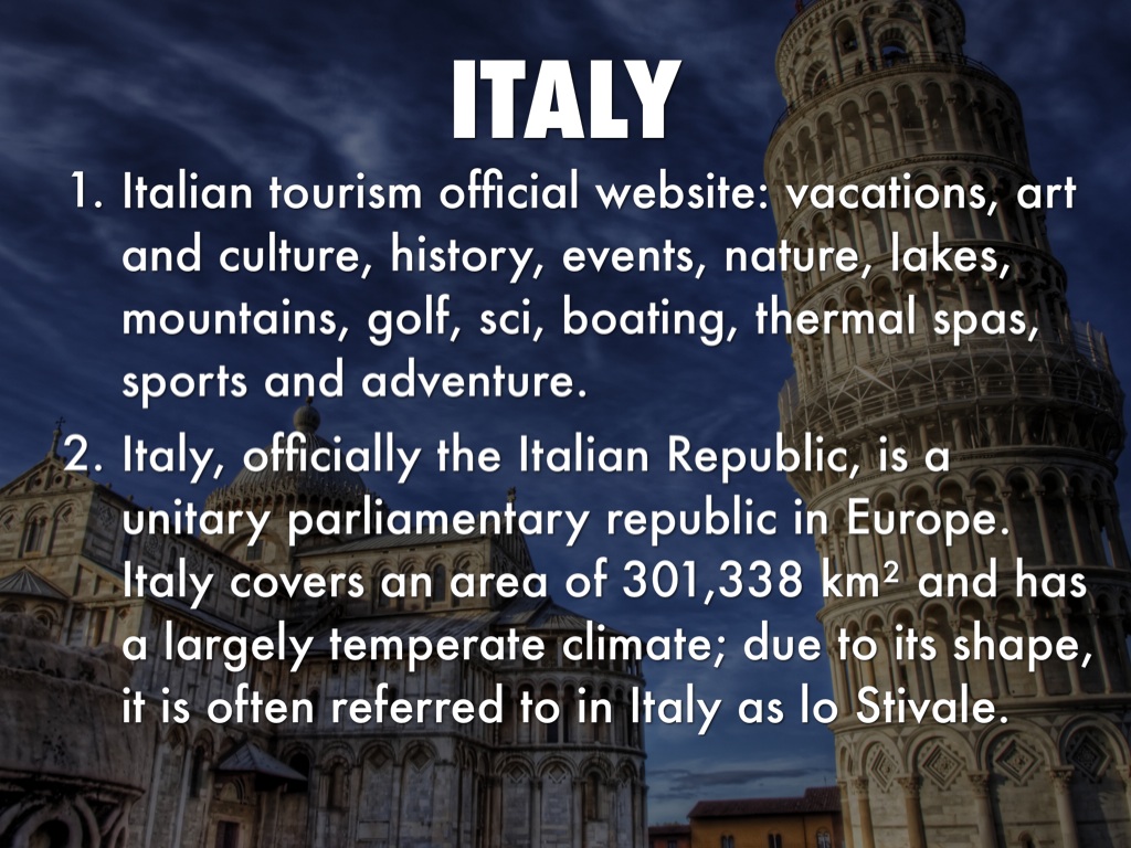 Italy, officially the Italian Republic, is a unitary parliamentary republic in Europe. Italy covers an area of 301,338 km² and has a largely temperate climate; due to its shape, it is often referred to in Italy as lo Stivale.