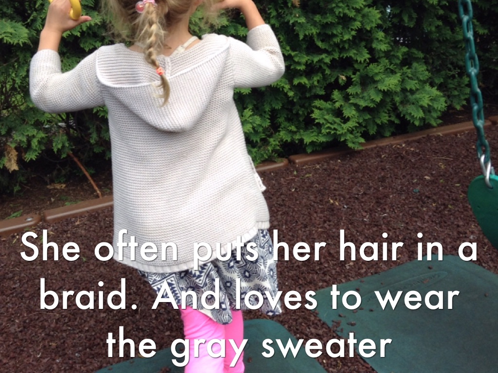 She often puts her hair in a braid. And loves to wear the gray sweater