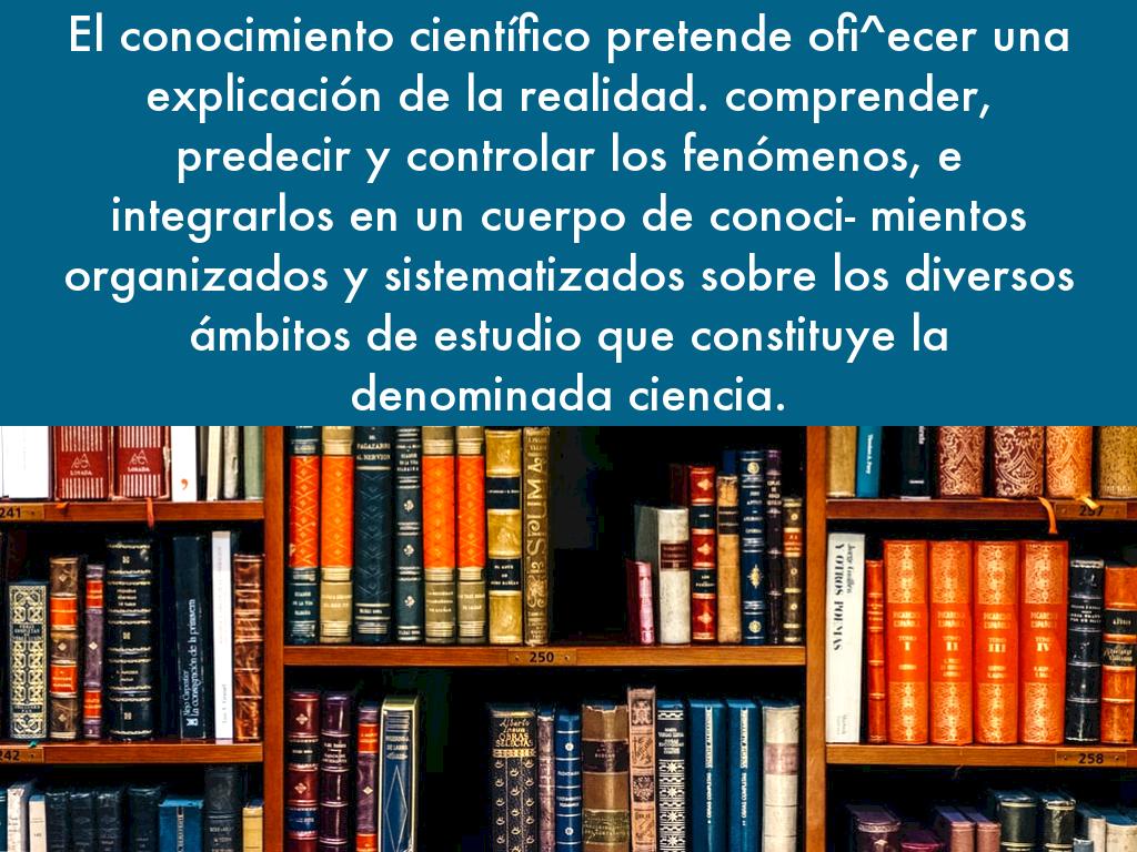El conocimiento científico pretende ofi^ecer una explicación de la realidad. comprender, predecir y controlar los fenómenos, e integrarlos en un cuerpo de conoci- mientos organizados y sistematizados sobre los diversos ámbitos de estudio que constituye la denominada ciencia.