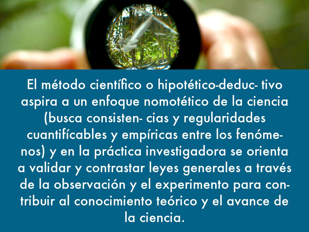 El método científico o hipotético-deduc- tivo aspira a un enfoque nomotético de la ciencia (busca consisten- cias y regularidades cuantifícables y empíricas entre los fenóme- nos) y en la práctica investigadora se orienta a validar y contrastar leyes generales a través de la observación y el experimento para con- tribuir al conocimiento teórico y el avance de la ciencia.