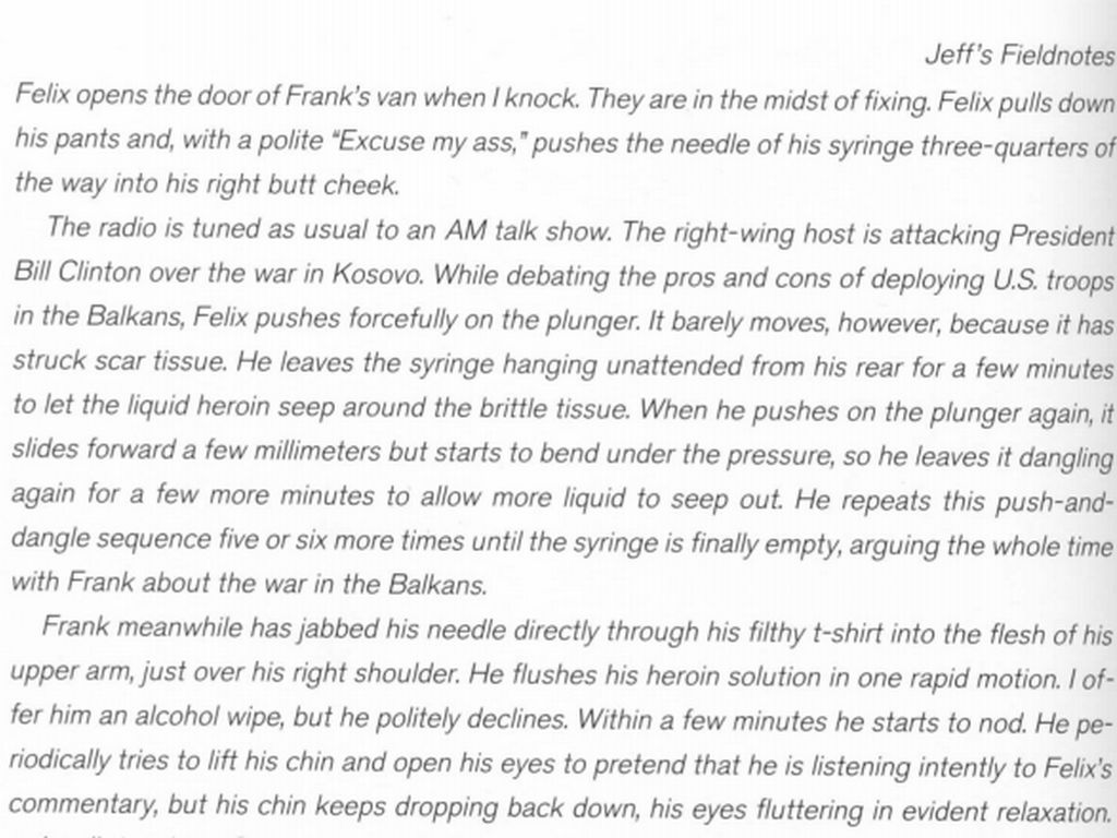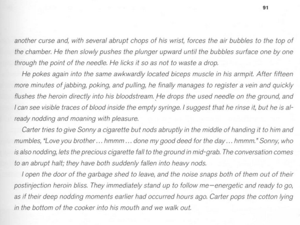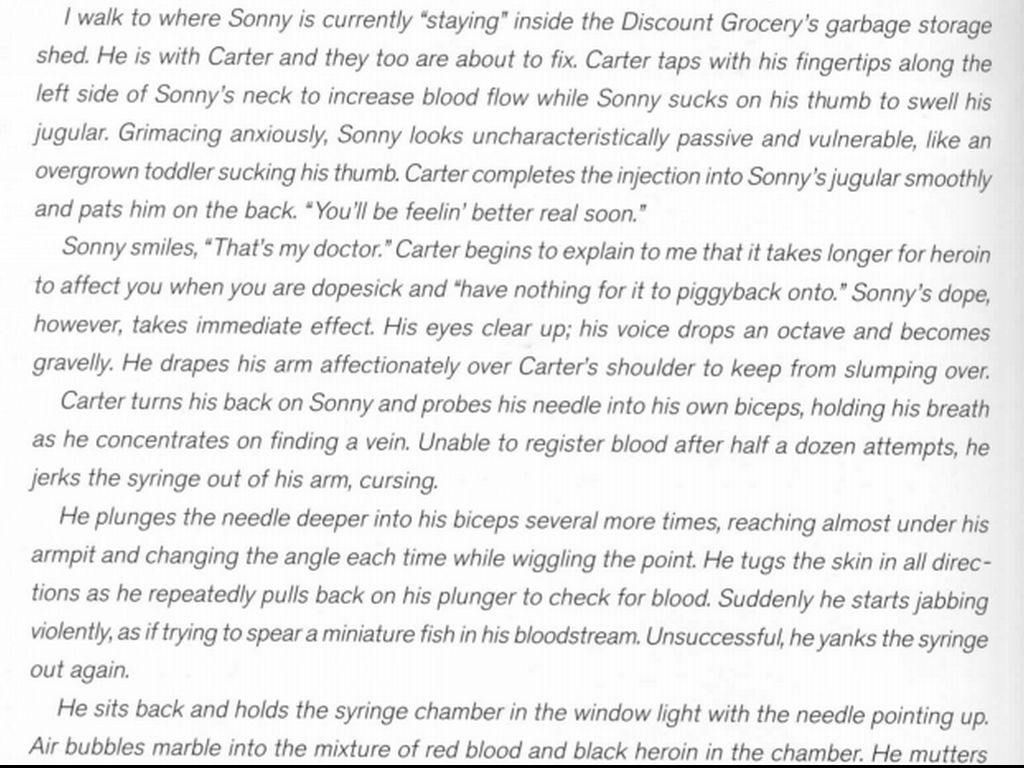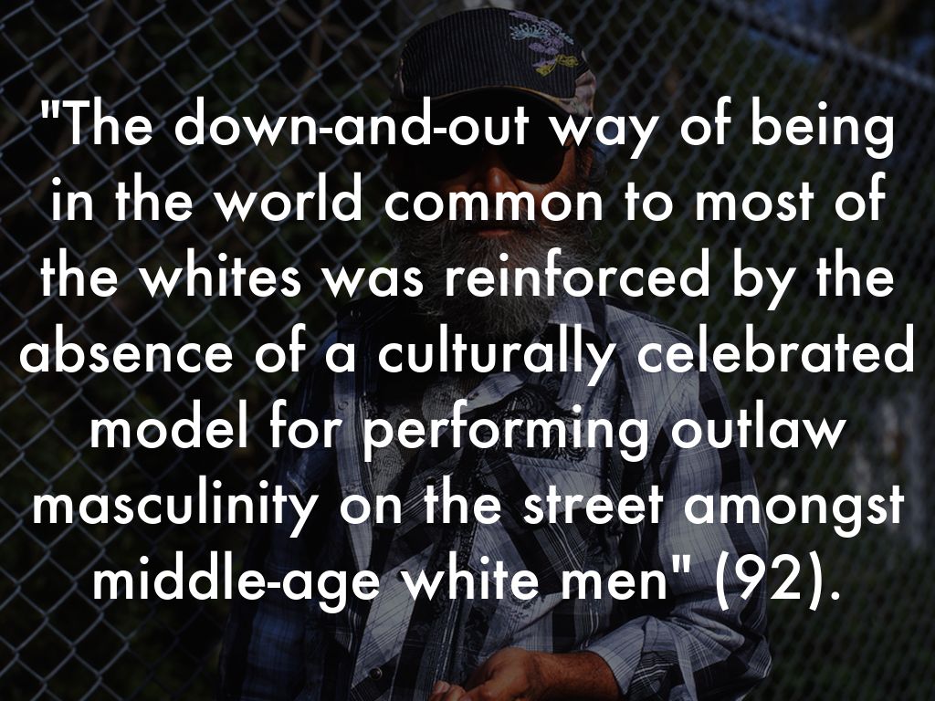 "The down-and-out way of being in the world common to most of the whites was reinforced by the absence of a culturally celebrated model for performing outlaw masculinity on the street amongst middle-age white men" (92).