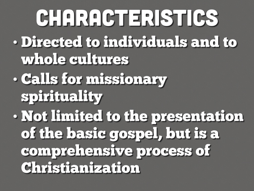Not limited to the presentation of the basic gospel, but is a comprehensive process of Christianization