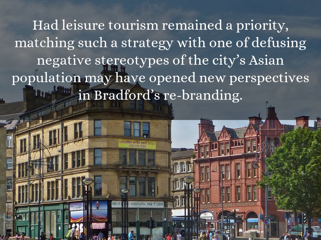 Had leisure tourism remained a priority, matching such a strategy with one of defusing negative stereotypes of the city’s Asian population may have opened new perspectives in Bradford’s re-branding.