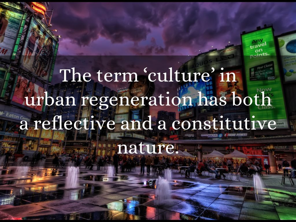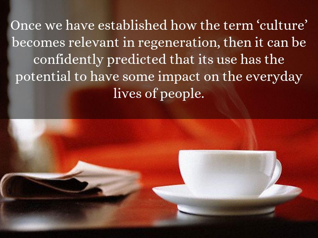 Once we have established how the term ‘culture’ becomes relevant in regeneration, then it can be confidently predicted that its use has the potential to have some impact on the everyday lives of people.