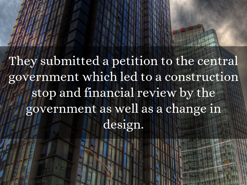 They submitted a petition to the central government which led to a construction stop and financial review by the government as well as a change in design.