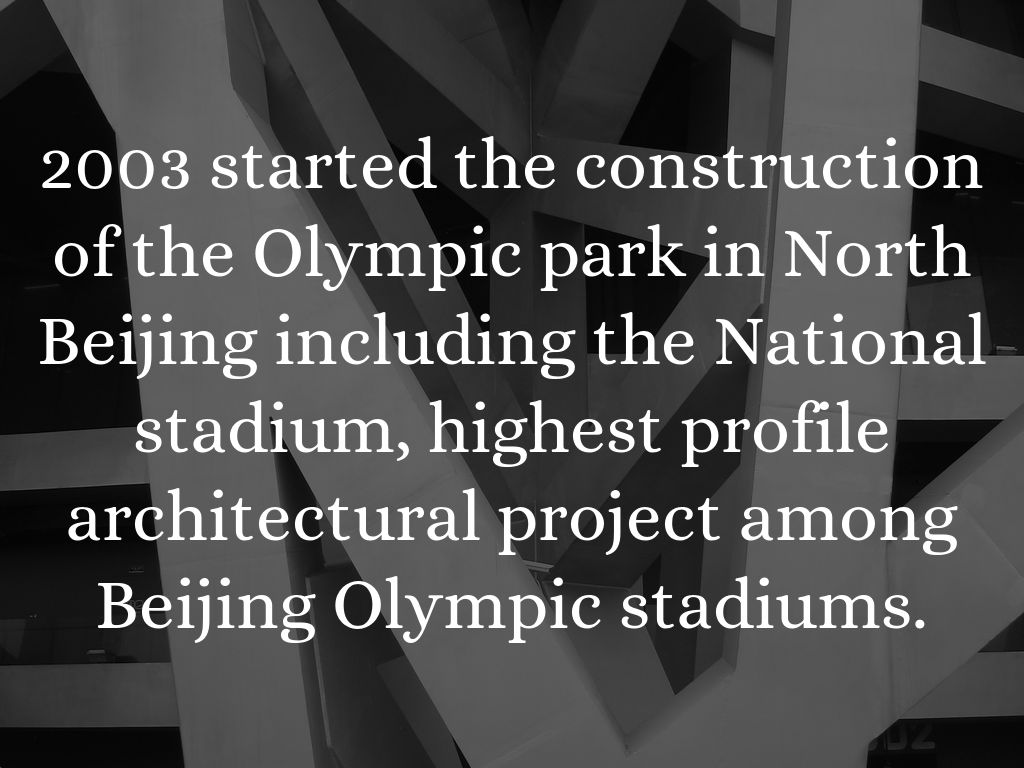 2003 started the construction of the Olympic park in North Beijing including the National stadium, highest profile architectural project among Beijing Olympic stadiums.