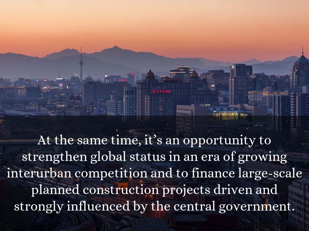 At the same time, it’s an opportunity to strengthen global status in an era of growing interurban competition and to finance large-scale planned construction projects driven and strongly influenced by the central government.