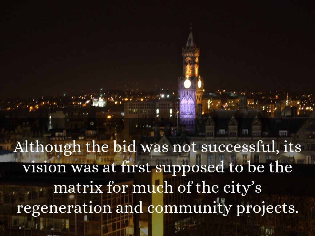 Although the bid was not successful, its vision was at first supposed to be the matrix for much of the city’s regeneration and community projects.