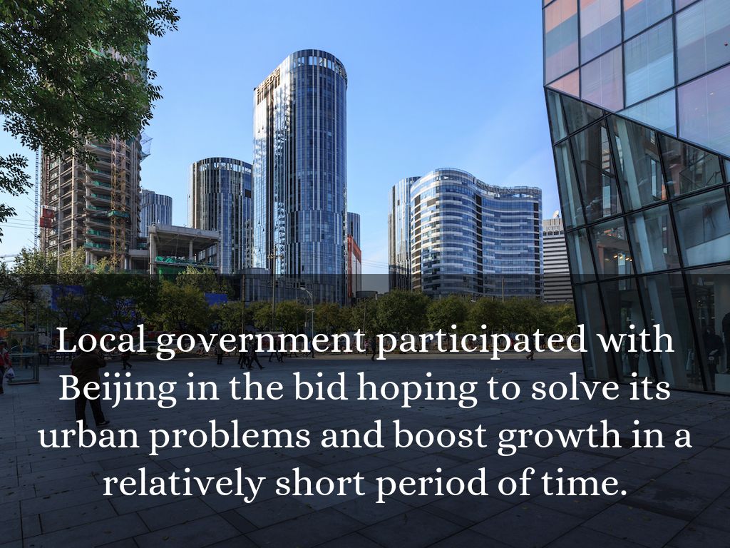 Local government participated with Beijing in the bid hoping to solve its urban problems and boost growth in a relatively short period of time.