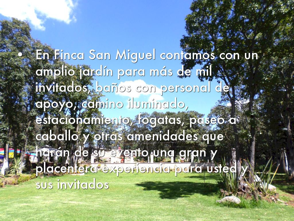 En Finca San Miguel contamos con un amplio jardín para más de mil invitados, baños con personal de apoyo, camino iluminado, estacionamiento, fogatas, paseo a caballo y otras amenidades que harán de su evento una gran y placentera experiencia para usted y sus invitados