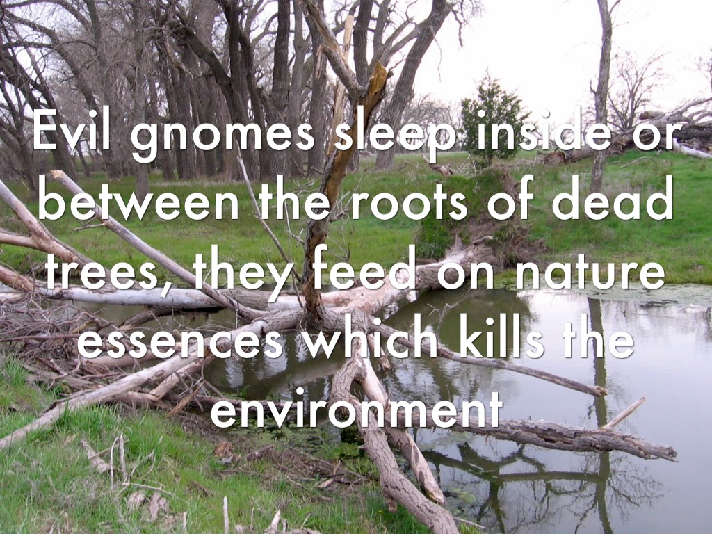 Evil gnomes sleep inside or between the roots of dead trees, they feed on nature essences which kills the environment