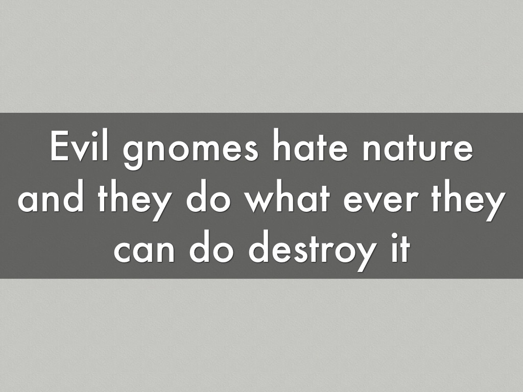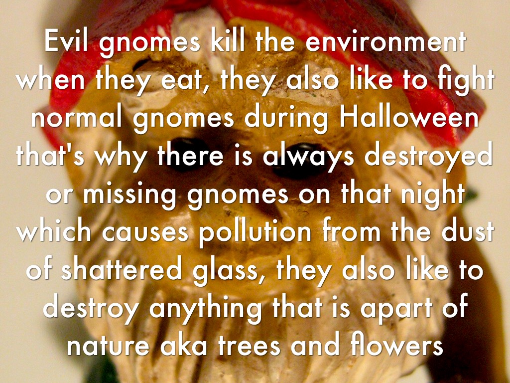 Evil gnomes kill the environment when they eat, they also like to fight normal gnomes during Halloween that's why there is always destroyed or missing gnomes on that night which causes pollution from the dust of shattered glass, they also like to destroy anything that is apart of nature aka trees and flowers