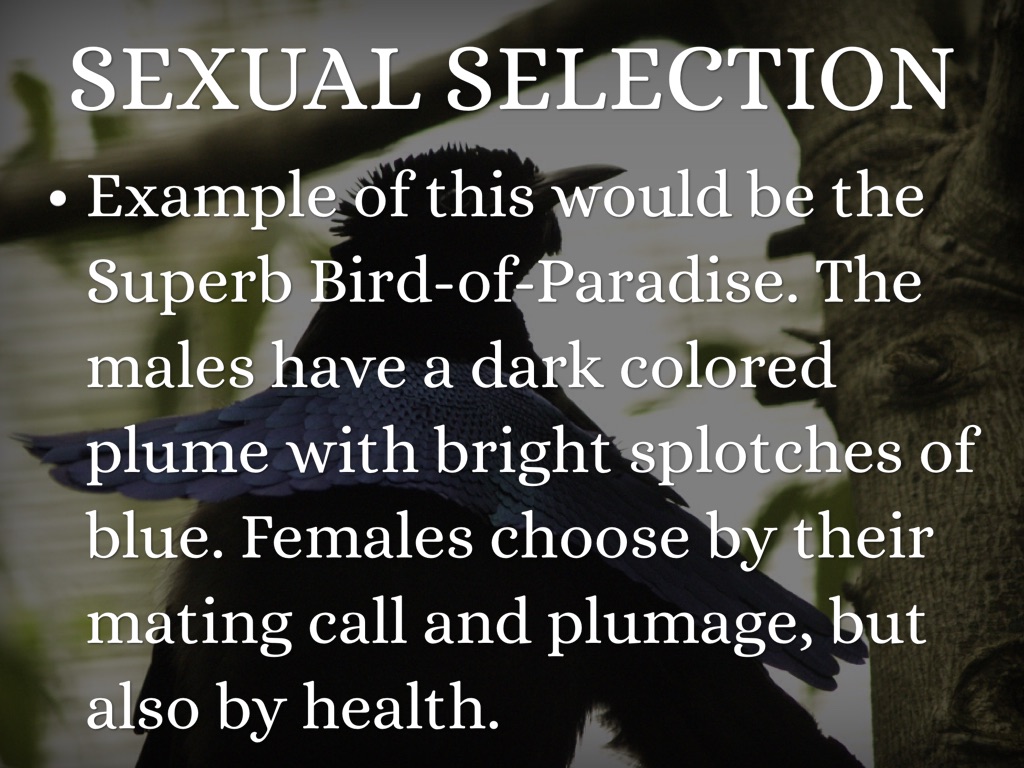 Example of this would be the Superb Bird-of-Paradise. The males have a dark colored plume with bright splotches of blue. Females choose by their mating call and plumage, but also by health.