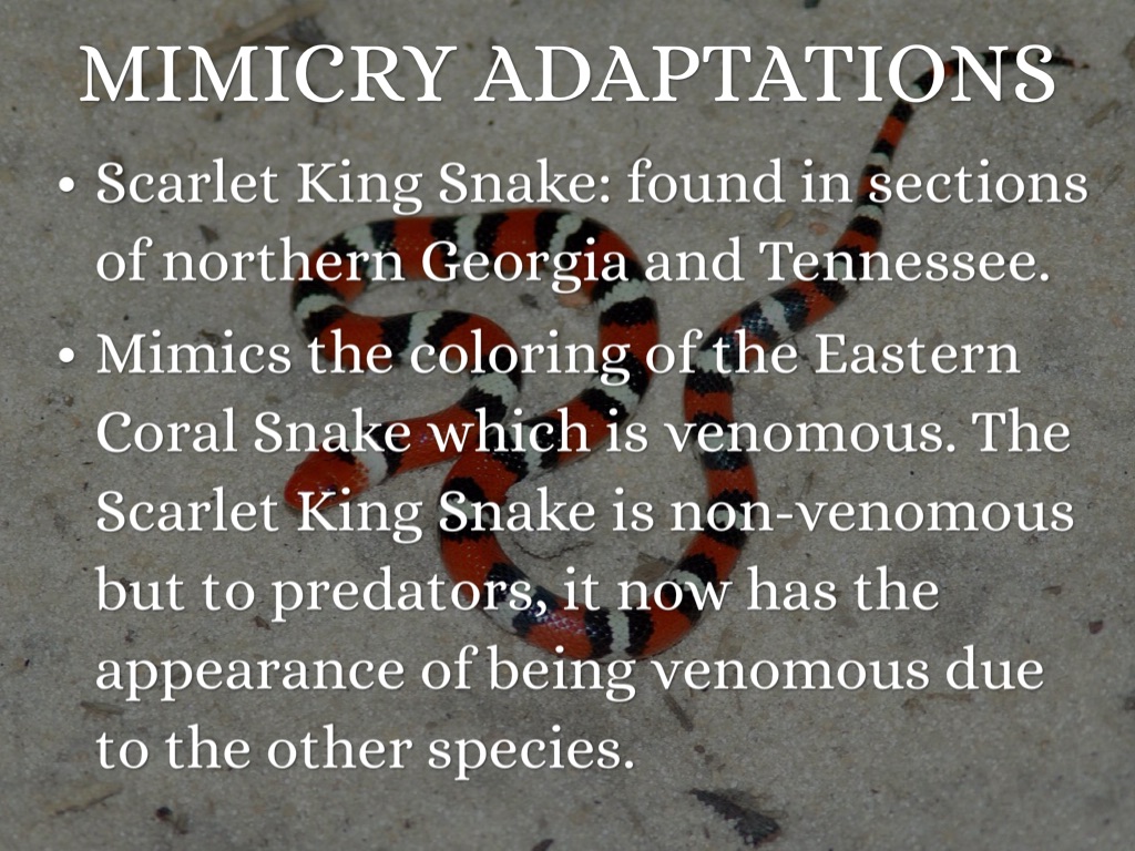 Mimics the coloring of the Eastern Coral Snake which is venomous. The Scarlet King Snake is non-venomous but to predators, it now has the appearance of being venomous due to the other species.