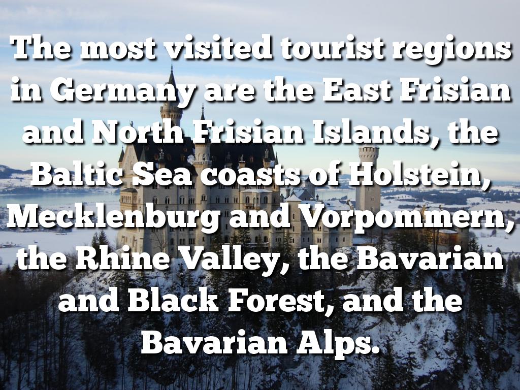 The most visited tourist regions in Germany are the East Frisian and North Frisian Islands, the Baltic Sea coasts of Holstein, Mecklenburg and Vorpommern, the Rhine Valley, the Bavarian and Black Forest, and the Bavarian Alps.